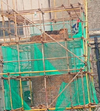 鍋爐都拆了,煙囪矗立在這里都好幾年沒冒煙了,現(xiàn)在煙囪拆除可與周邊小區(qū)美化相協(xié)調(diào),環(huán)境肯定能改善,多好?。 弊≡诮?jīng)三緯九鍋爐房附近的居民徐女士說。7日,該處鍋爐廠房內(nèi)45米高的磚煙囪已被綠色的防護網(wǎng)嚴密的包裹起來,工作人員正在緊張忙碌地進行著拆除作業(yè)?!盀榉乐故┕て陂g碎石、碎磚墜落砸傷過往行人,我們做了嚴密的防護措施,加了腳手架,腳手架內(nèi)外又加了嚴密的防護網(wǎng),拆除作業(yè)周邊派專門的安全員提醒行人和車輛注意安全。
